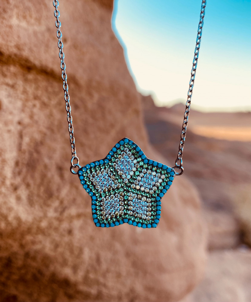 • وصف المنتج : تعليقة مصنوعة من الفضة الإيطالية يوجد مرصعة بالزيركون الازرق بدرجاته المميزة علي شكل نجمة .