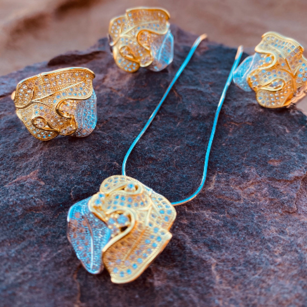 - عدد القطع: 4 قطع; حلقان، خاتم، سلسلة.